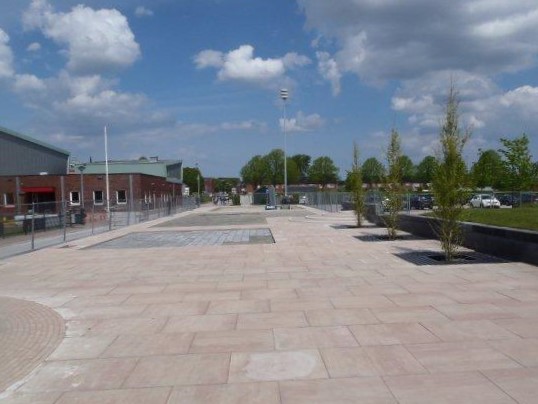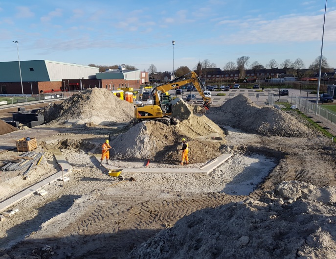Voor dit project heeft Elzinga alle infra mogen aanleggen voor de Gemeente Eemsmond. De speeltoestellen worden op een later moment aangebracht door een derde partij. Wat dit project bijzonder maakt voor Elzinga is onder andere het gebruik van verschillende materialen. Een voorbeeld hiervan is de Terre Armee-wand bij de speelheuvel op de Roegte. De Terre Armee-wand wordt normaal gesproken namelijk gebruikt voor de bouw van bijvoorbeeld een viaduct. Dit aspect geeft een ruige/ stoere kant aan de ontmoetingsplek. Interessant is dat deze wand in zijn totaliteit 4 meter hoog is, waar deze normaliter voor een viaduct wel 40 meter hoog kan zijn. Daarnaast is er voor een deel van De Strip en Roegte gebruik gemaakt van betonnen tegels. Deze tegels zijn machinaal gelegd, aangezien deze 90x90x8cm grote tegels 155 kilo (!) per stuk wegen. Gezien de toepassing van vele verschillende materialen, in een betrekkelijk klein gebied waar veel (school)kinderen zich bevinden, was het niet alleen een heel bewerkelijke klus, maar ook logistiek een uitdaging.